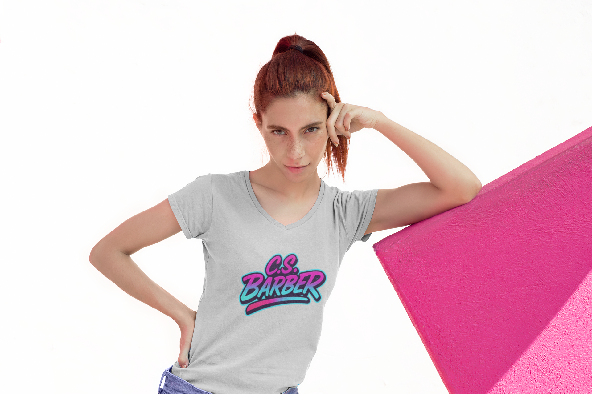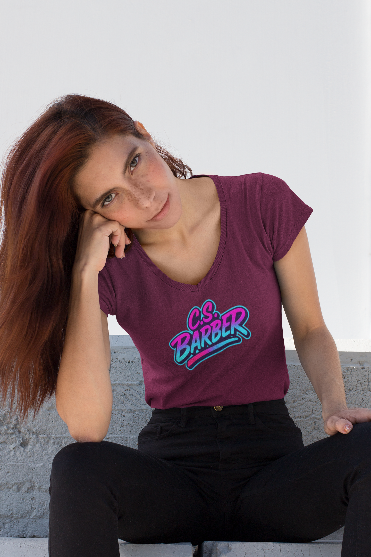 ladies short sleeve v-neck one side. FRONT- retro c.s. barber logo