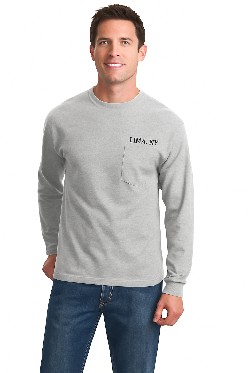 long sleeve front pocket double side FRONT- lima, ny BACK- classic logo
