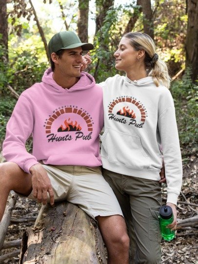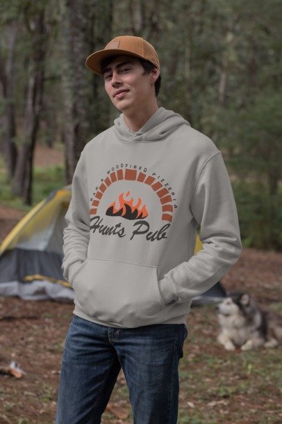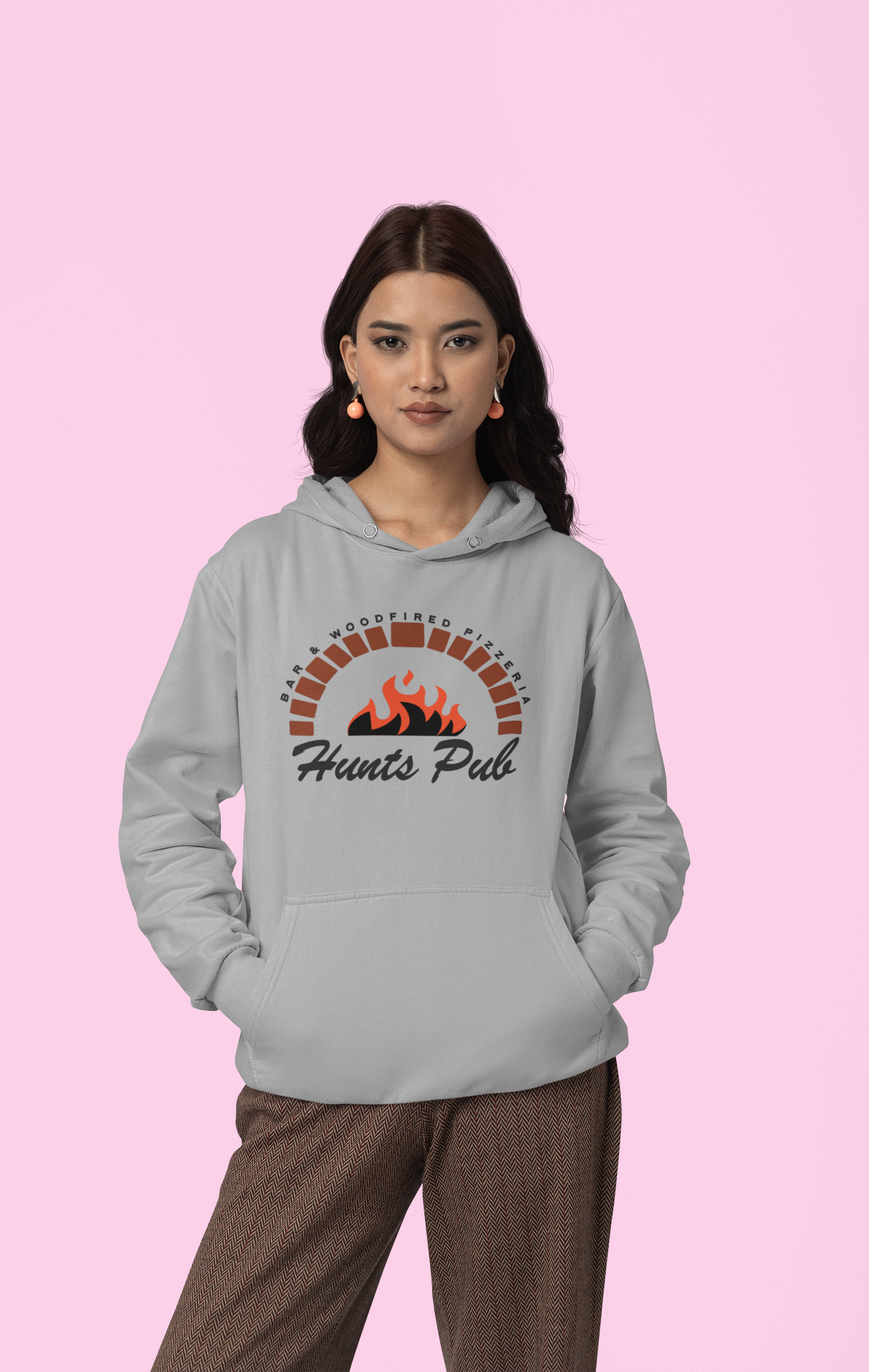 Pull over hoodie with one sided font logo. classic hunts fire logo.