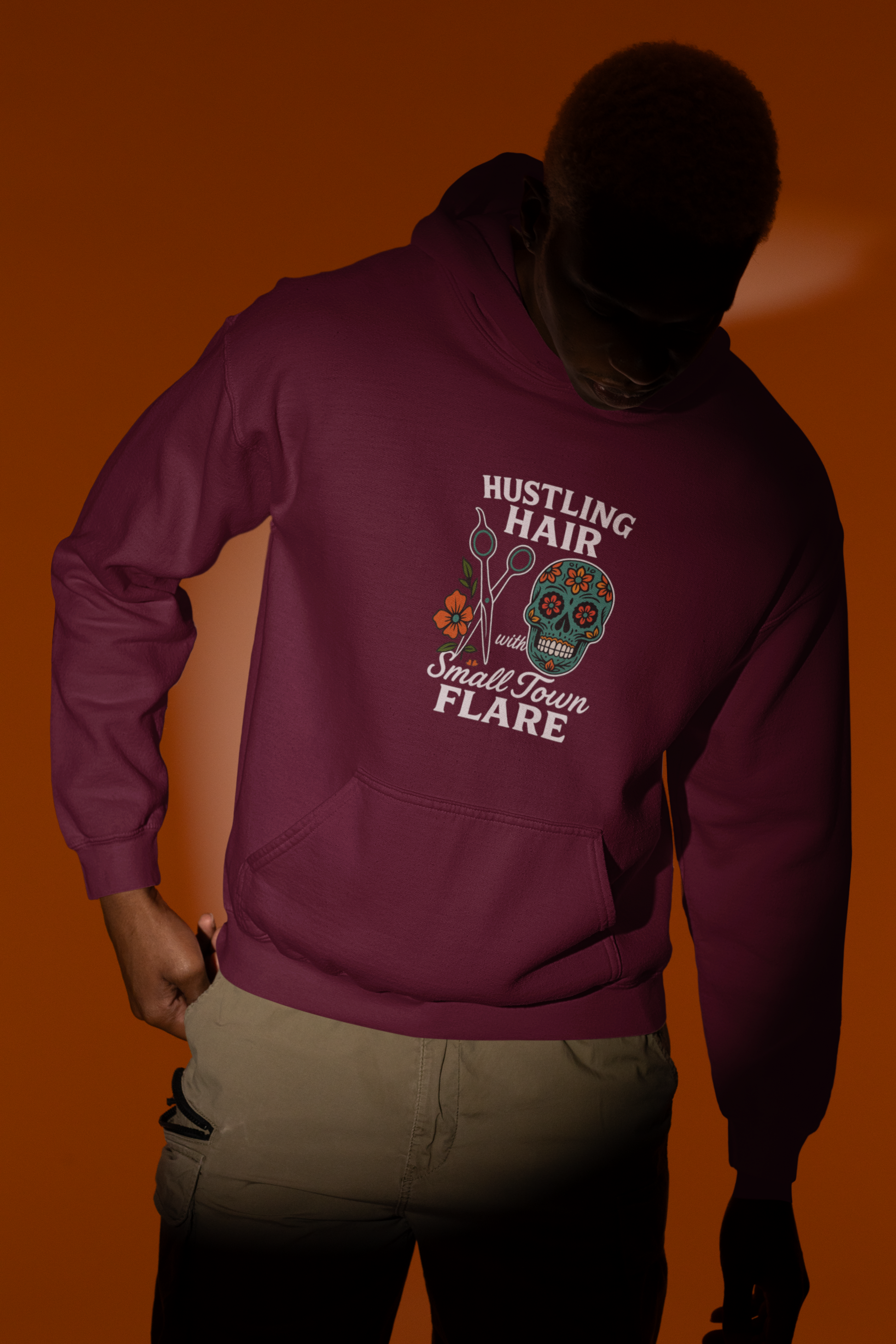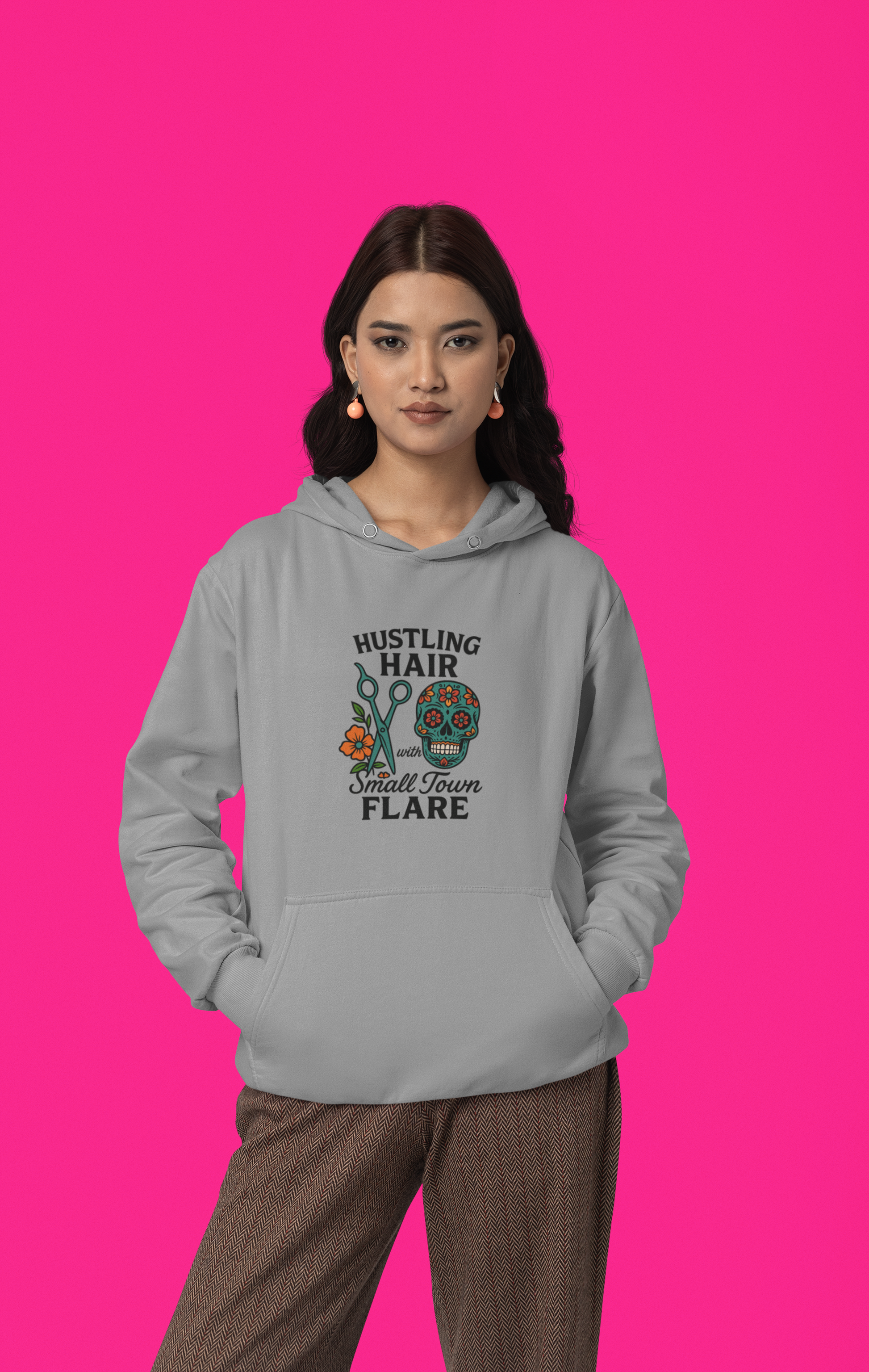 unisex hoodie double sided logo. FRONT-hustling hair (candy skull) BACK-QR code.