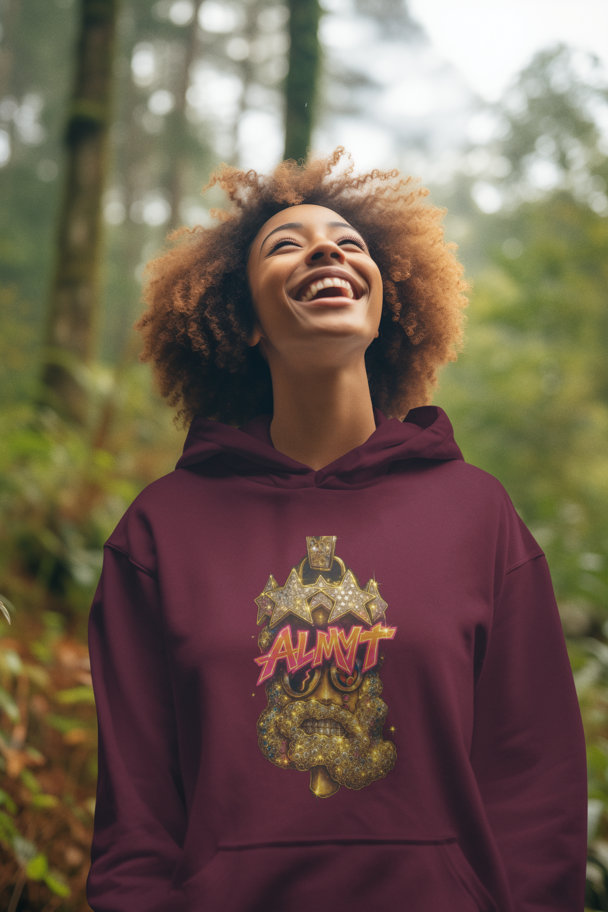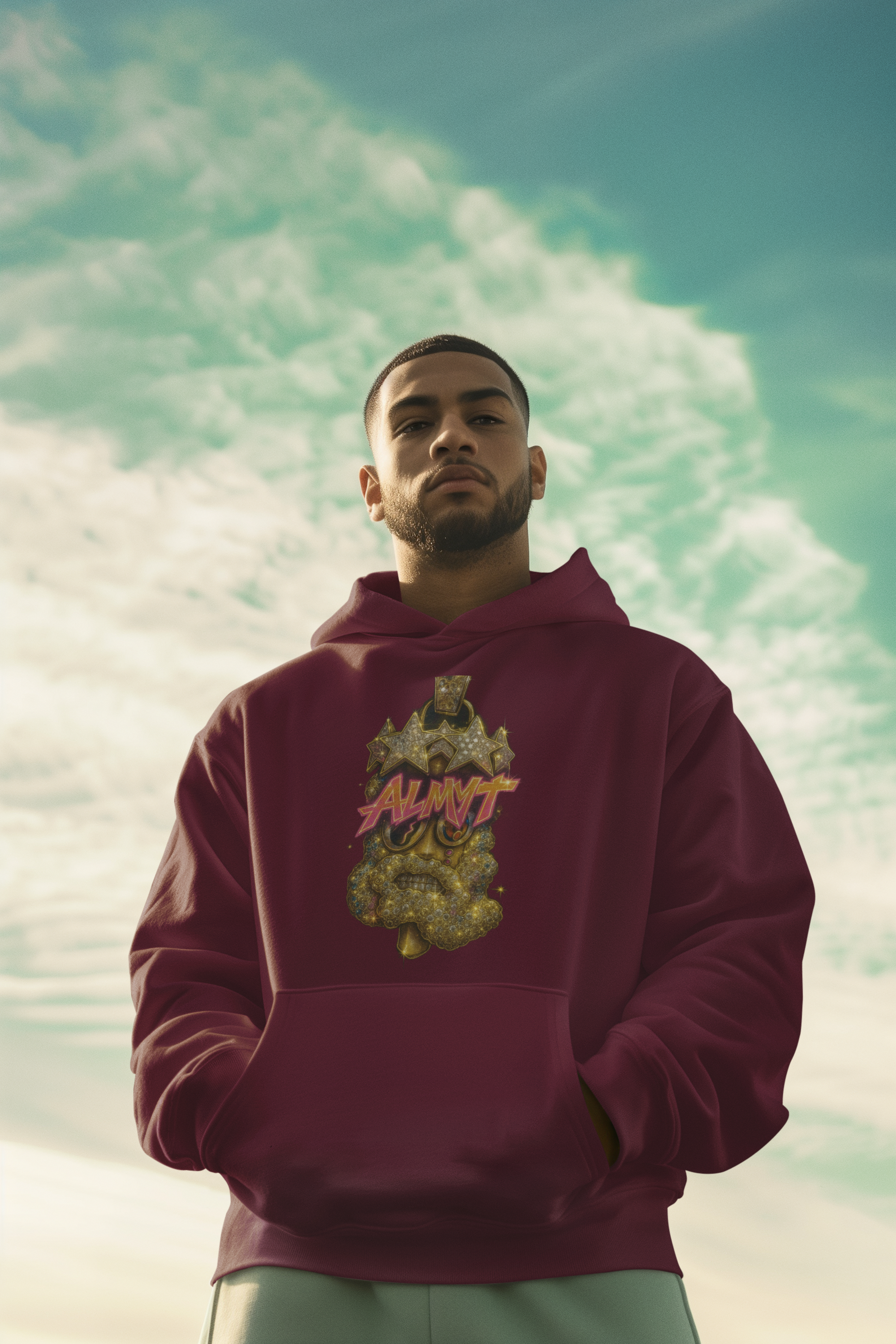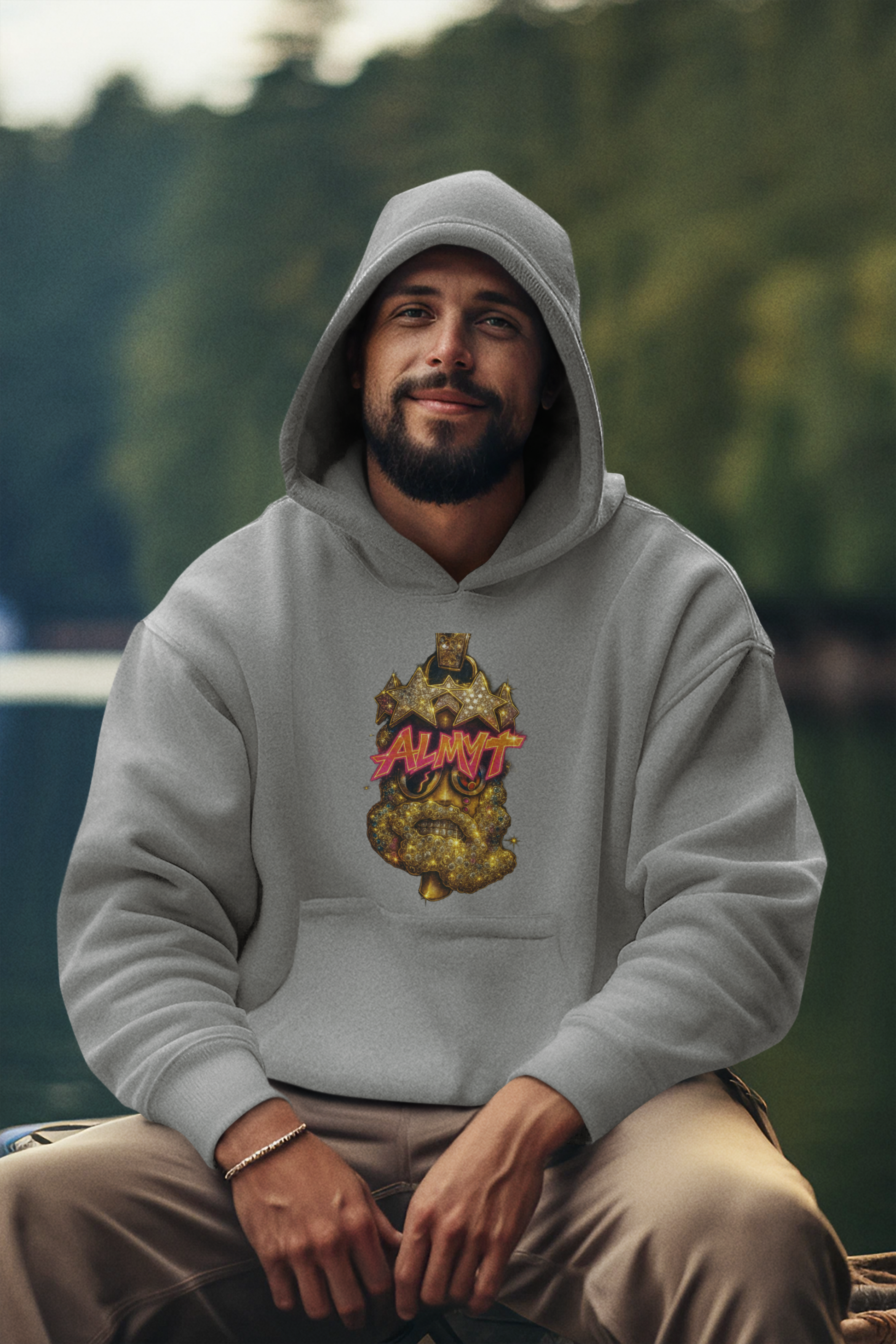 unisex pull over hoodie. one sided logo. FRONT- gold chain logo