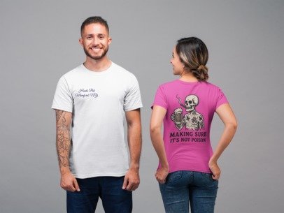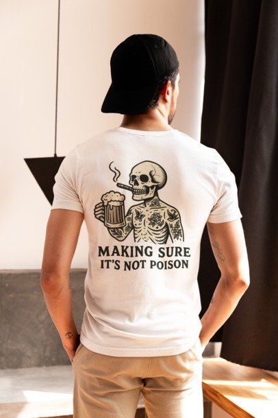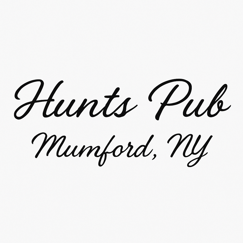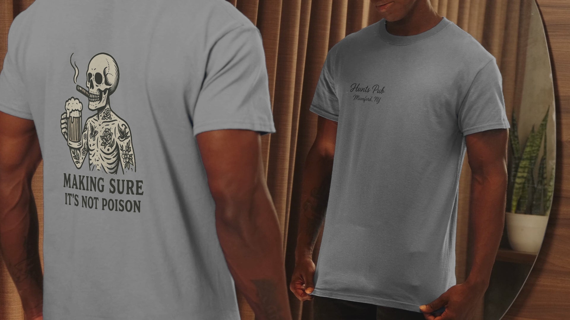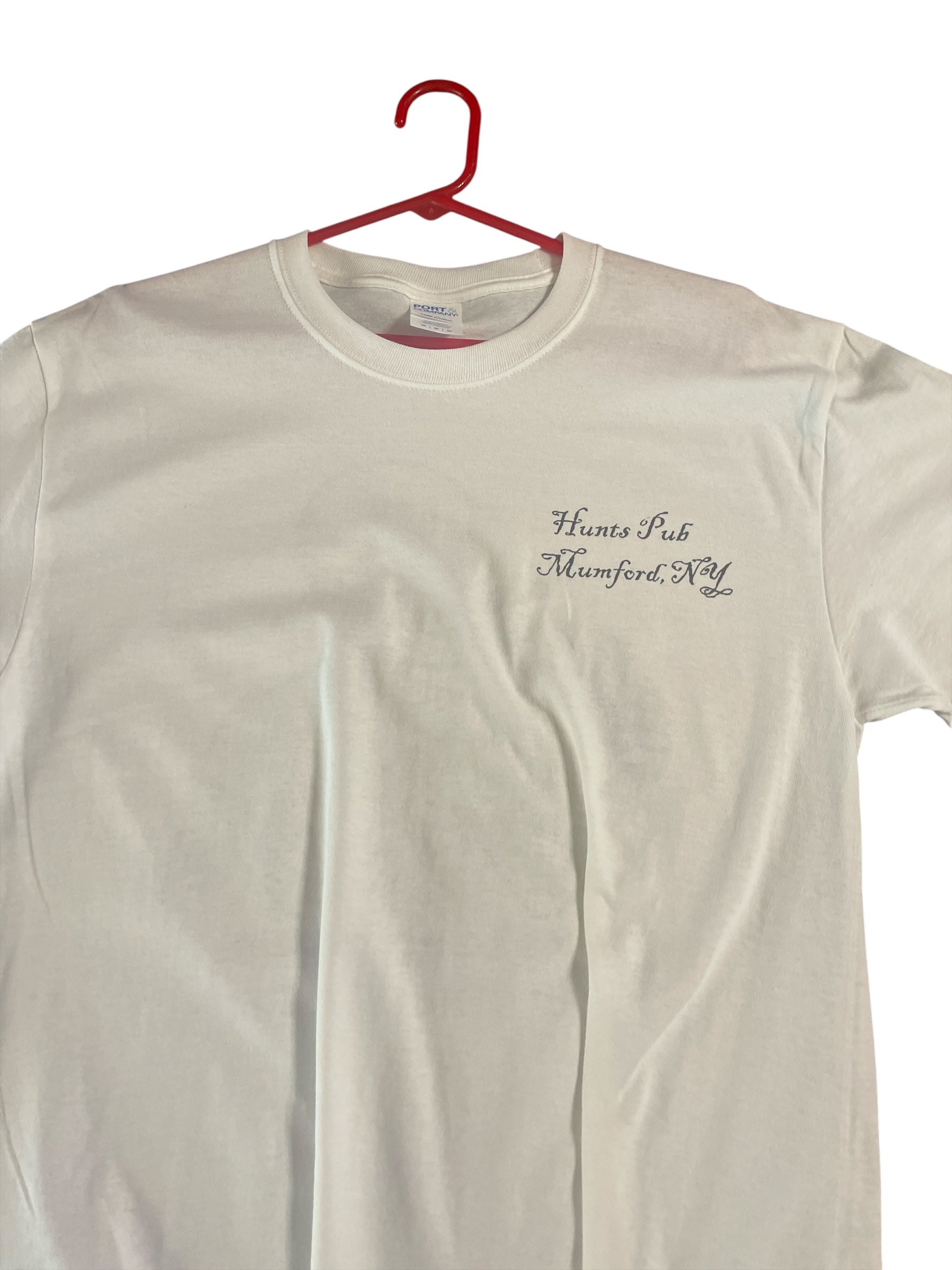 unisex short sleeve t-shirt. Double sided logo. (front) Hunts Pub - Mumford, NY. (back) Make sure it's not poison Skelton logo.