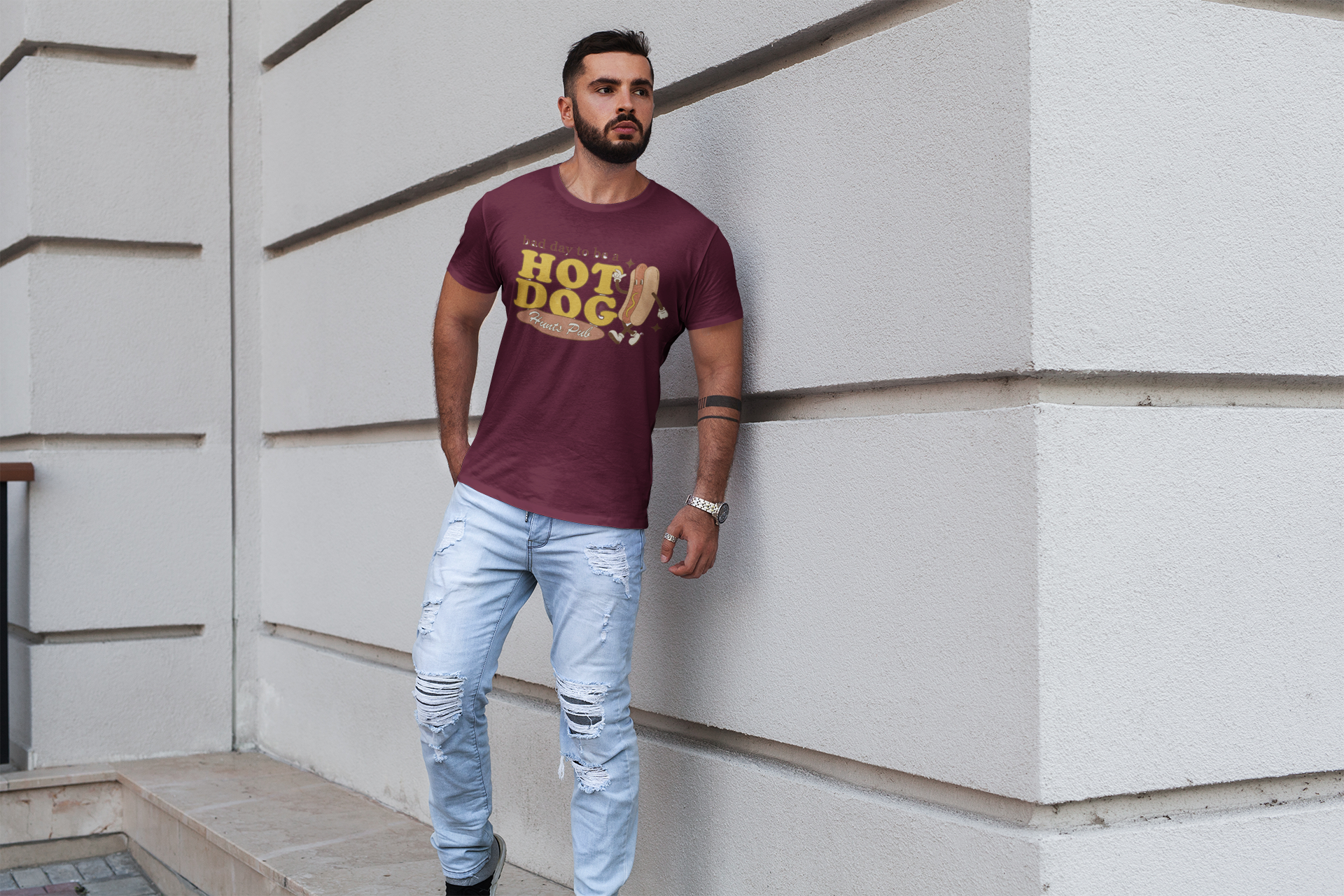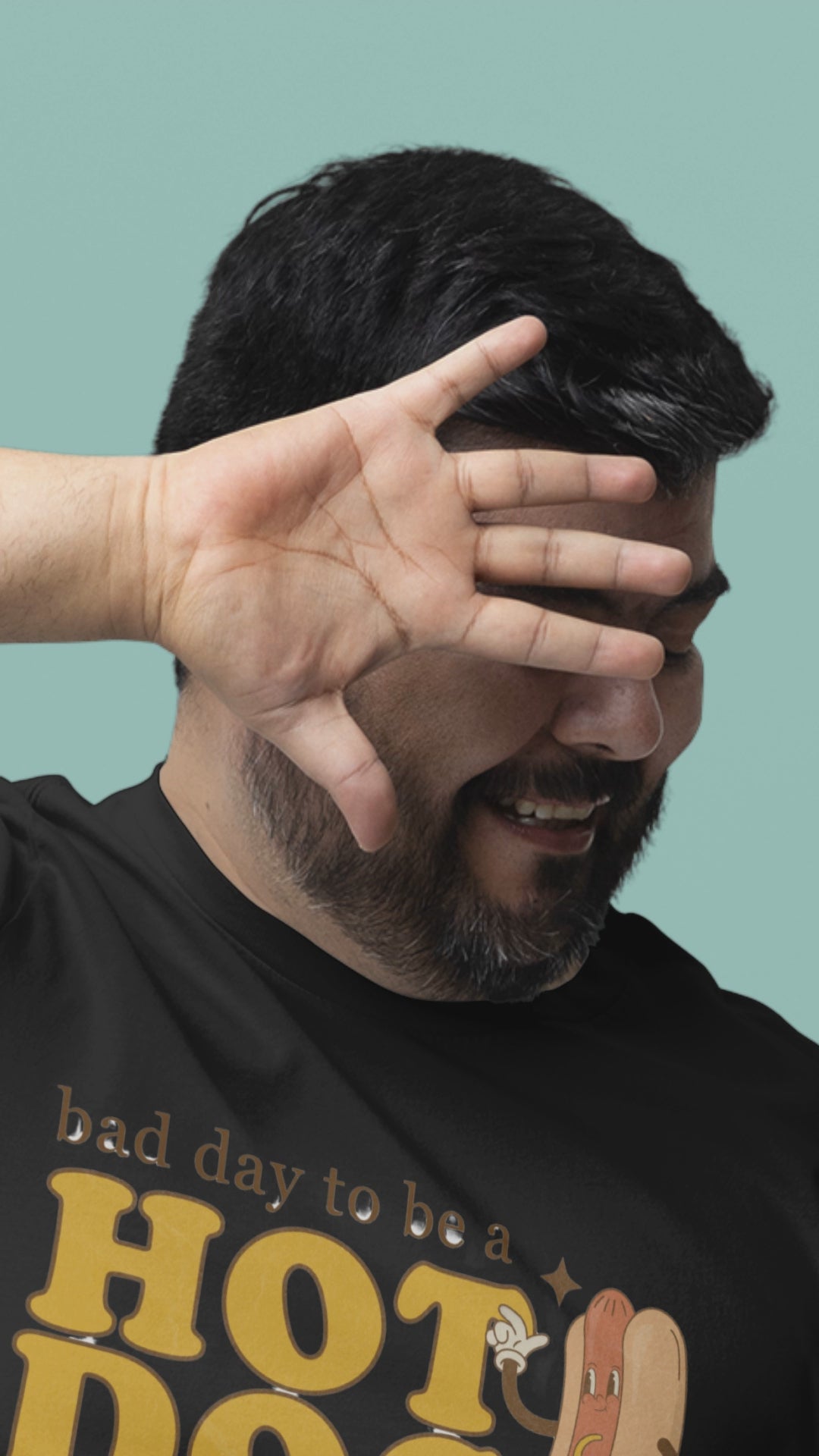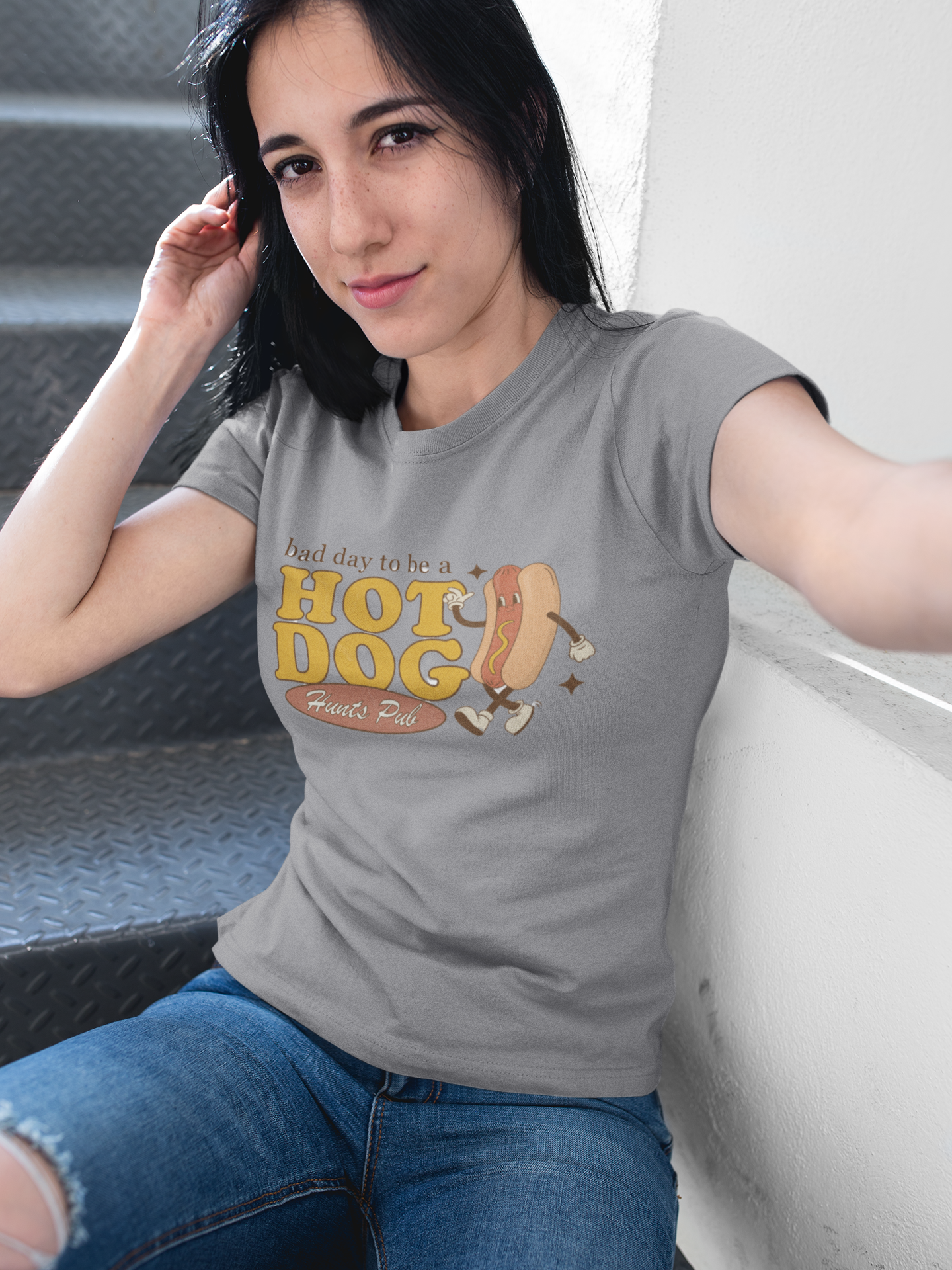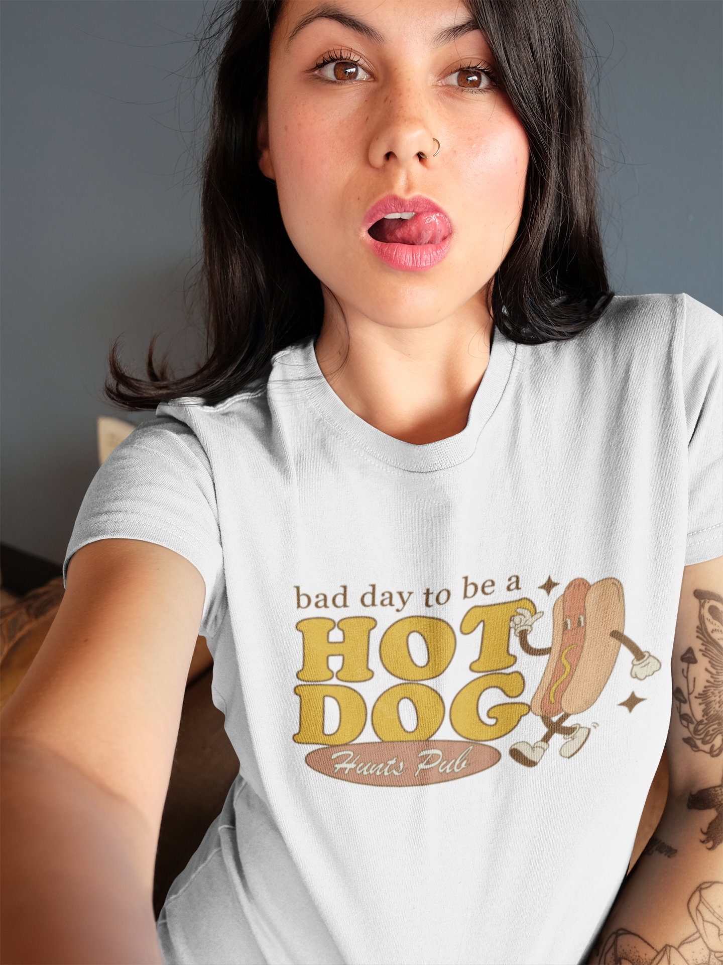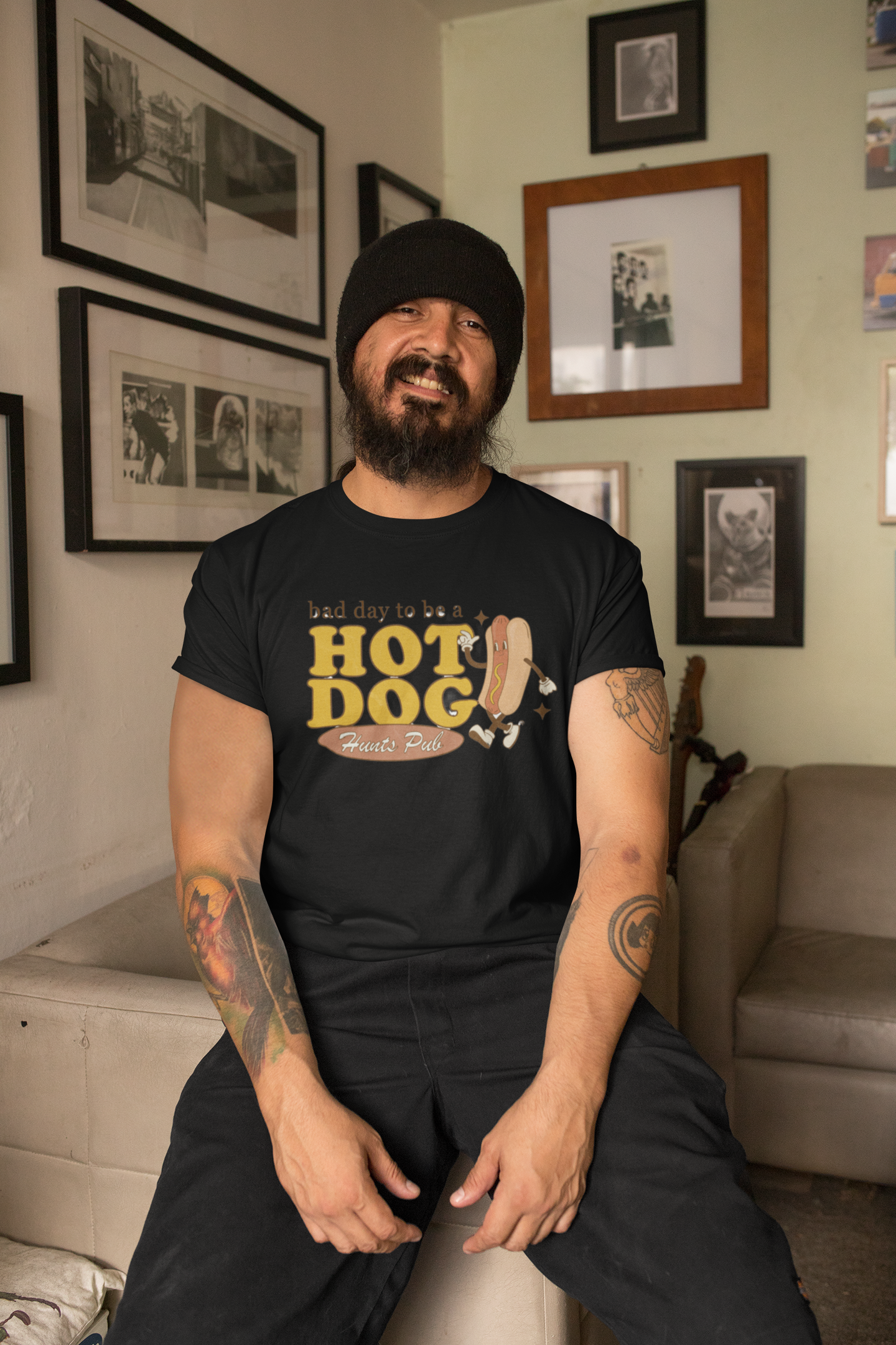 unisex short sleeve t-shirt. One sided logo on front. Bad day to be a hot dog logo.