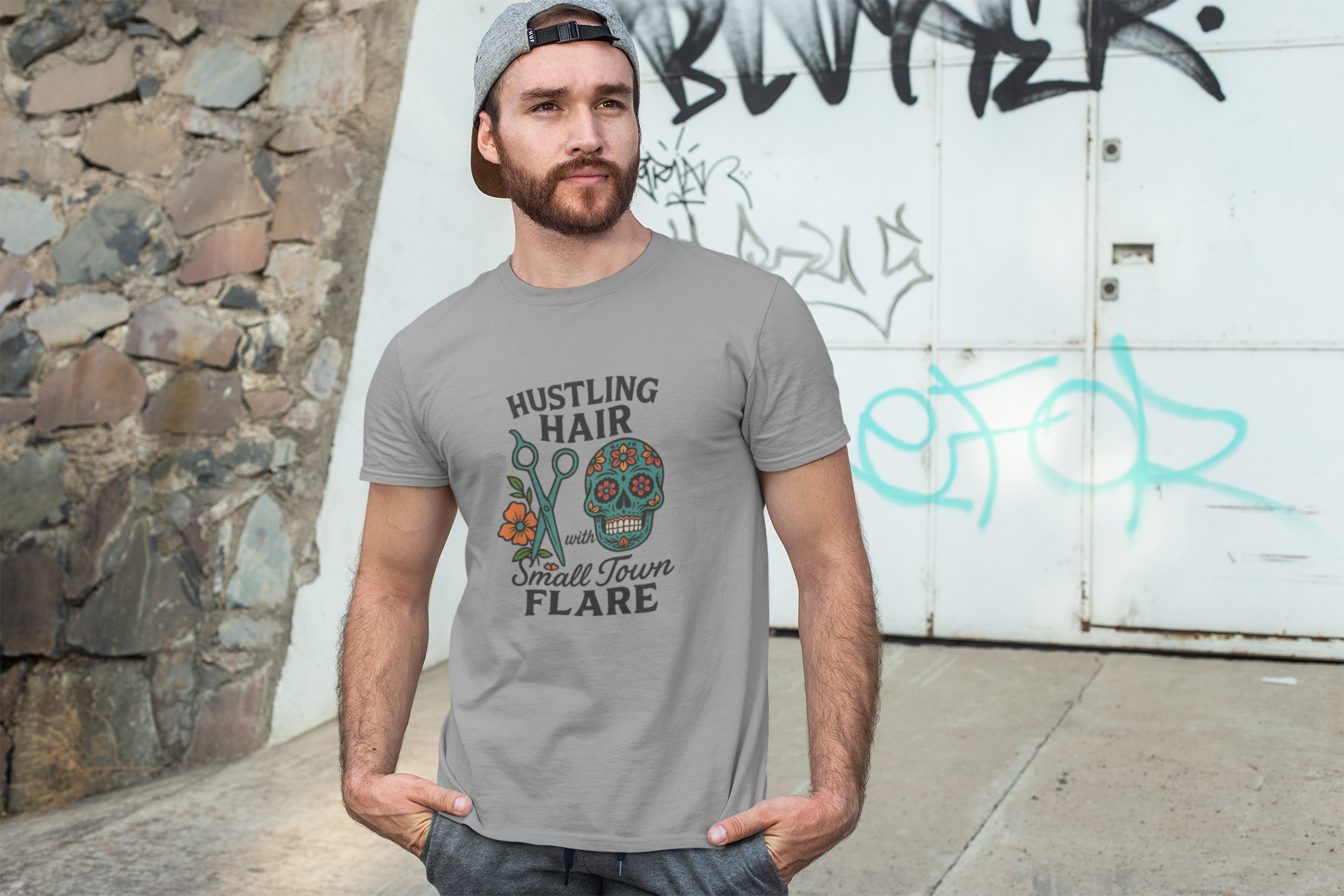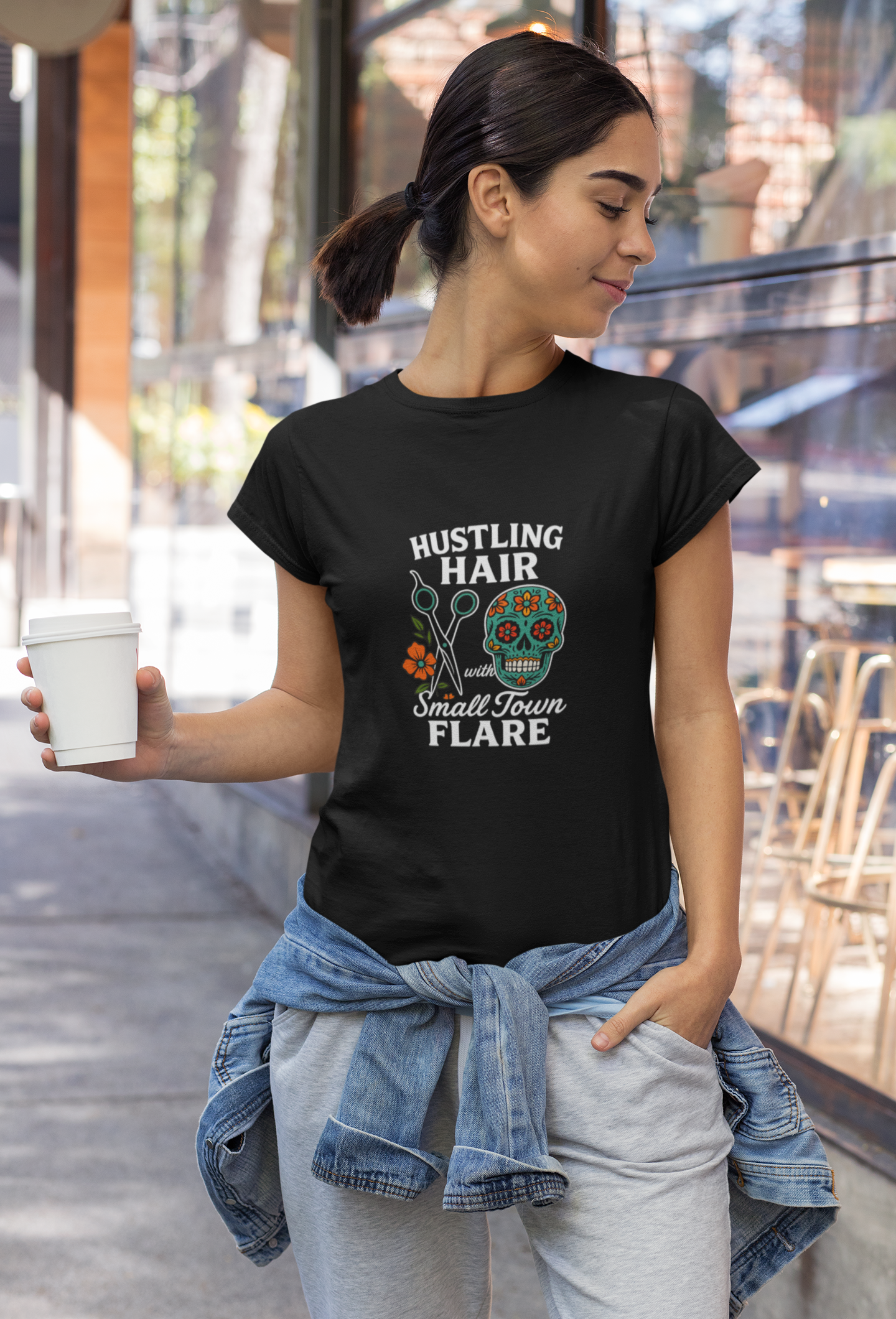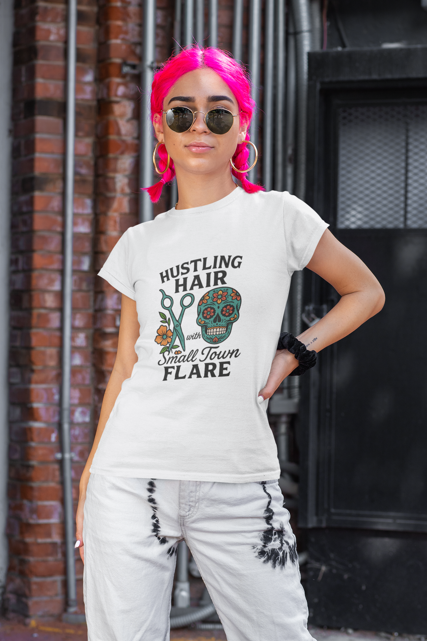 unisex short sleeve t-shirt. Front logo. hustling hair with sugar skull