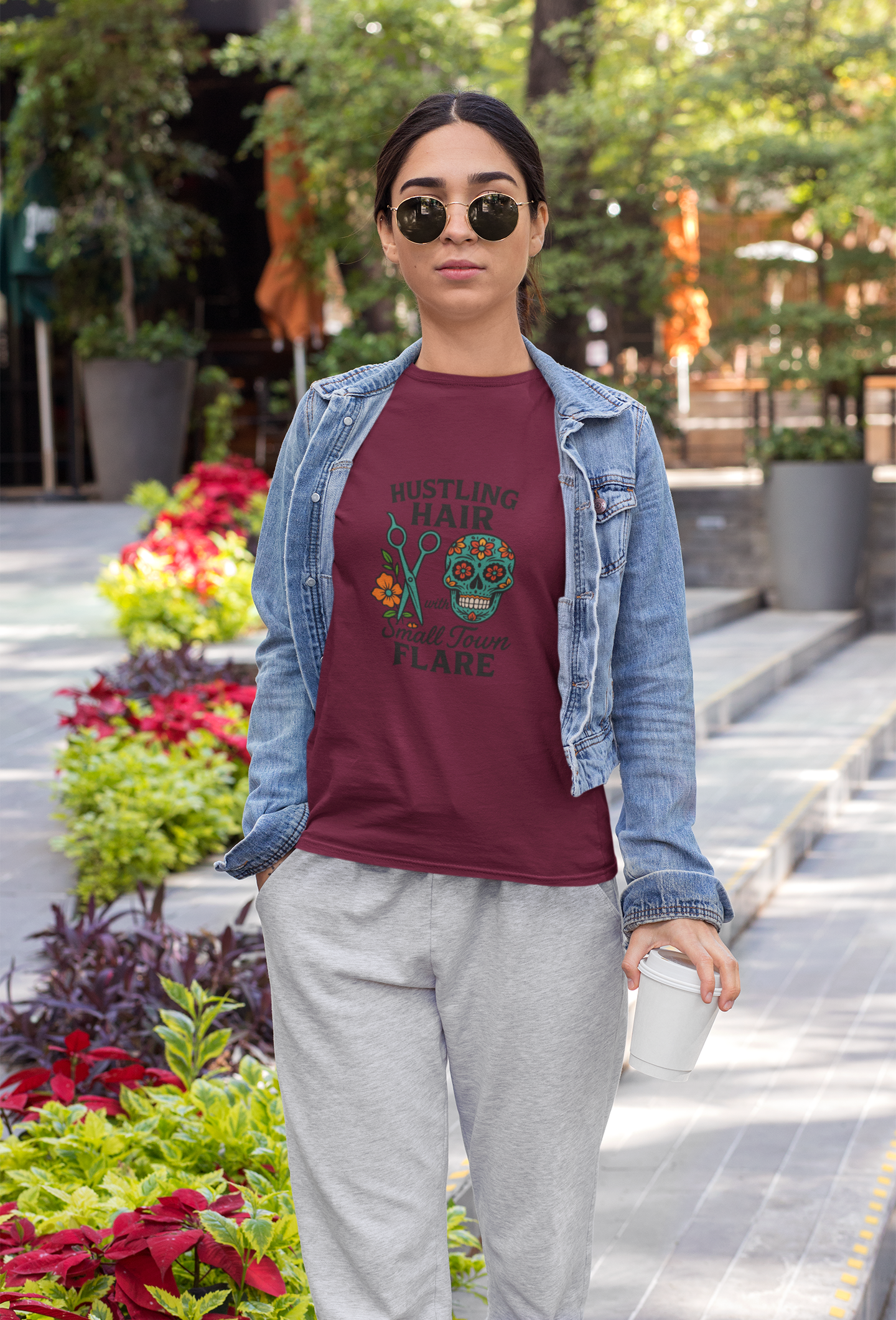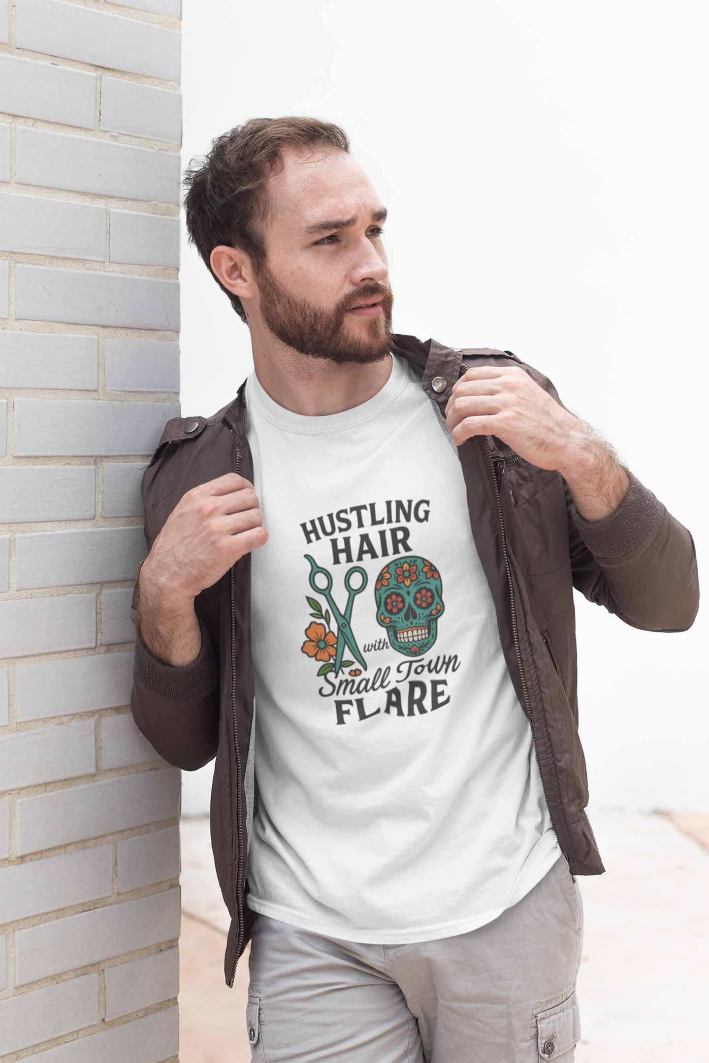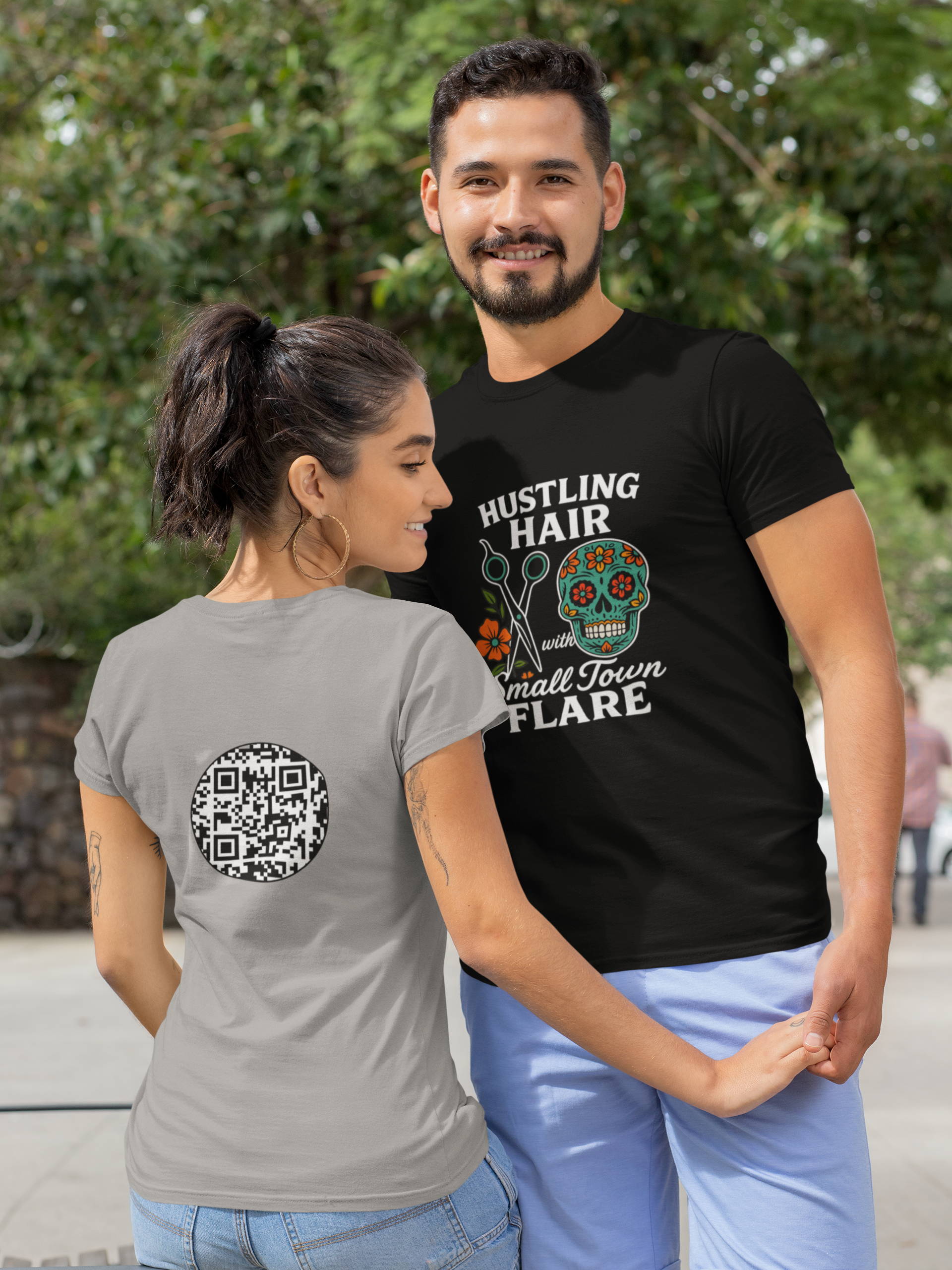 unisex short sleeve t-shirt. Front logo. hustling hair with sugar skull